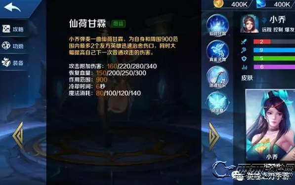 一技能仙荷甘霖,治疗自身及900码范围内两名受伤的英雄,并且提升下一次普攻伤害,冷却时间仅6秒,能提升伤害的持续时间也为6秒,等于说只要时间卡的好,可以释放一次仙荷甘霖后等待5秒,再攻击敌方英雄,一秒后立刻再释放再平A,配合其他小乔技能,能够出其不意轻松击杀。