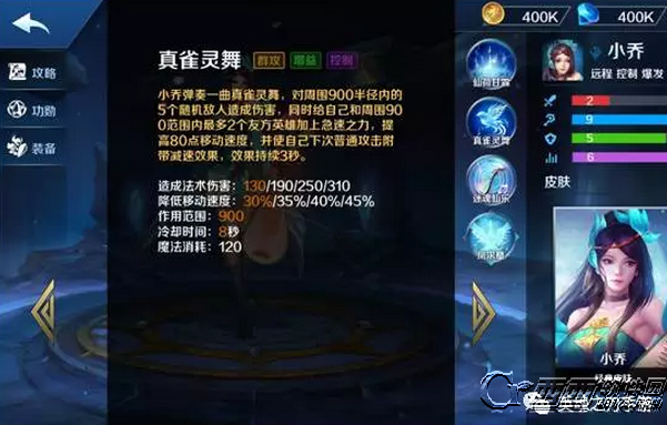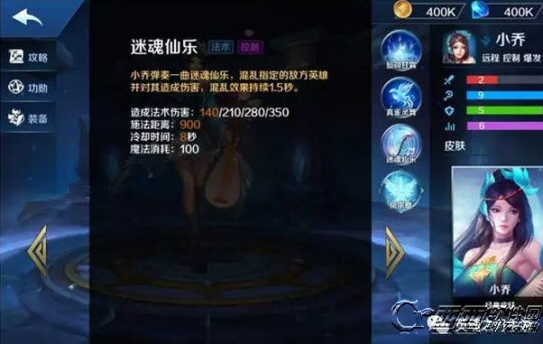 三技能迷魂仙乐,混乱一名敌方英雄1.5秒同时满级造成350魔法伤害,冷却时间8秒,施法距离900。这边可以看到,小乔的1,2,3技能范围同时都是900,所以大家如果空间感好的话,玩起小乔来会如鱼得水。