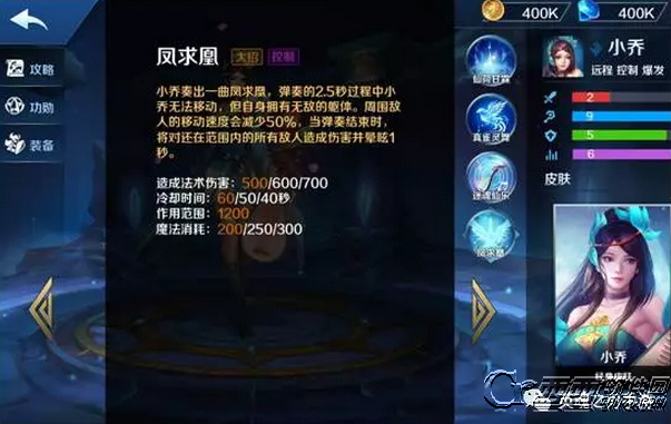 终极技能凤求凰,弹奏一曲凤求凰,持续2.5秒,小乔自身会变成无敌状态,期间1200码大招范围内敌人减速50%,当弹奏结束时还处于大招内敌人将额外晕眩1秒钟且受到500/600/700点魔法伤害。和PC的大招不太一样,主要体现在2个点上