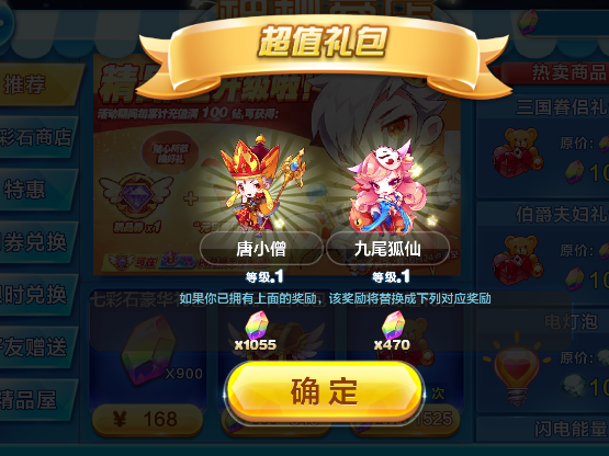 礼包内容:1级永久唐小僧+1级永久九尾狐仙