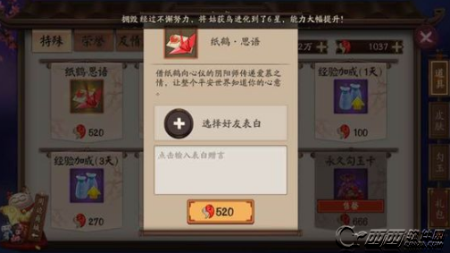 给别人的表白点赞,有机会获得10勾玉、草纸、800金币、15~20点体力中的一个奖励。