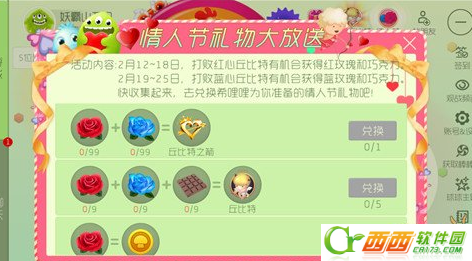 9朵红玫瑰,9朵蓝玫瑰,9块巧克力,可兑换【丘比特】皮肤碎片,可用于合成、晋升关键词皮肤“丘比特”,可兑换5次;