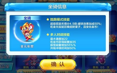 金元年兽的技能是超级奖励关得分4.5倍,磁铁效果加成50%,吃金元宝召唤招财童子,顶新年方块召唤春节吉祥物