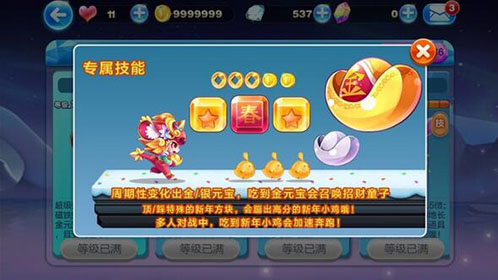 超级奖励关得分4.5倍,磁铁效果加成50%,吃金元宝召唤招财童子,顶新年方块召唤春节吉祥物