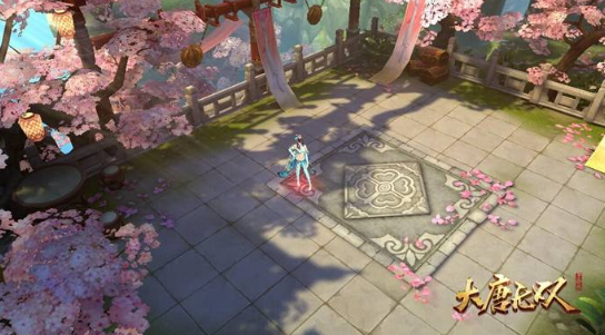 在长安地图西边,地图上一篇粉红色的提示很明显,这里满是桃花的庭院,如落英缤纷,很适合花前月下的两人谈谈情说说爱。