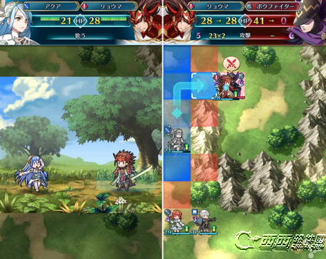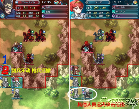 ③ 进战的第一回合,我方枪兵扛住敌人弓箭手,并且反击干掉敌方红剑。同时 BOSS、绿魔都会往左移动,而蓝魔因为移动力和地形关系,暂时堵在比较后面的位置。