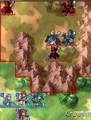 双防较高的请职业(比如枪骑士)、可以一个人开无双的龙马、高防并能反击远程的海克托尔这些角色打起来稍微轻松。另外龙骑卡米拉也可以起手干掉弓兵后,直接翻越山脉 1 v 4。配合再动职业(舞娘、歌女)和治疗职业可能更为有利。但人物选择并不固定,关键还是战棋执行的每一步的谨慎和严密。