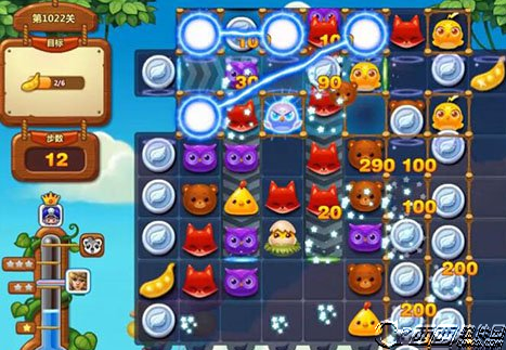 消除左侧连接传送带位置的元素,这样可以保证右侧的元素会不断的下降,这样金豆荚就会逐渐的下落到左侧的位置。然后在中间制作出特效,这样就可以来消除左侧的元素,收集金豆荚。