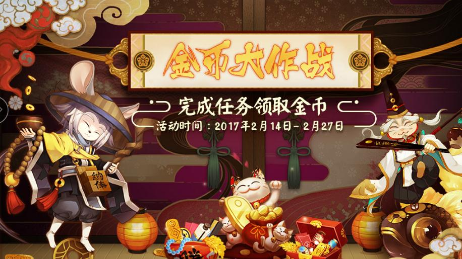 金币大作战将于2月14日上线,阴阳师大人可通过参加斗技、完成每日任务、召唤(破碎的符咒除外)等方式,达成任务条件,领取大量的金币奖励。