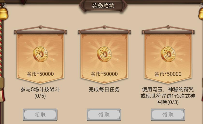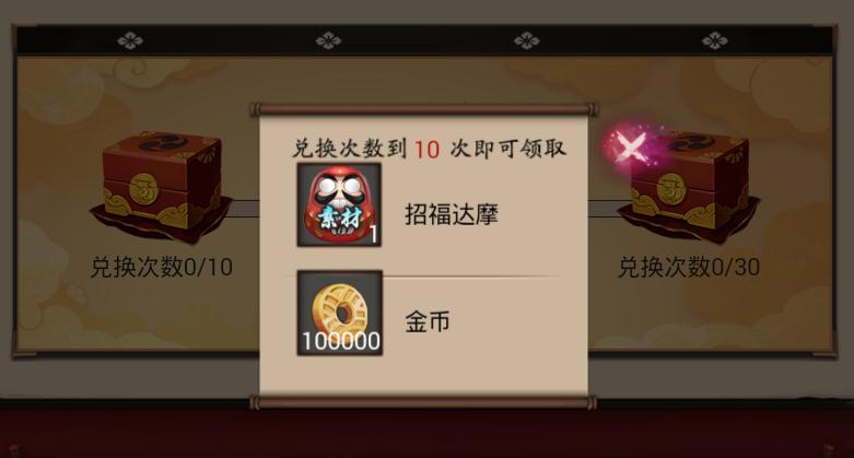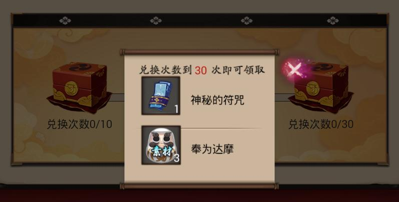 每兑换30次金币奖励额外多一个神秘符咒和奉为达摩一个