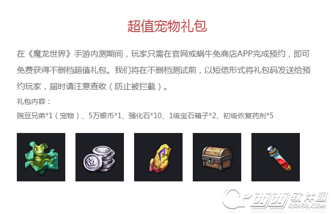 在《魔龙世界》手游内测期间,玩家只需在官网或蜗牛免商店APP完成预约,即可免费获得不删档超值礼包。我们将在不删档测试前,以短信形式将礼包码发送给预约玩家,届时请注意查收(防止被拦截)。