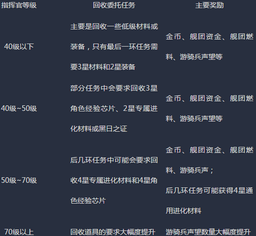 随着委托任务环次提升,回收的物品要求会有所提高,舰长也会得到更好的报酬。
