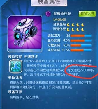 星辰迁移仪: 技能光速跃迁,拾取650星星后,关底boss和金币关的星星不计,每95s至少触发1次。战机免伤3s,发射星辰冲击,在不同敌机间跳跃6次,每次造成72W伤害。