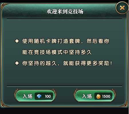 在随机组成的套牌中选择你所中意的一套,每一张卡牌都可以选择,使用选出的套组与真实对手进行对战,最多可连胜9场。