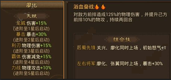 廖化:蜀国紫将廖化是一个重暴击的武将,提升到二星就能增加30%的暴击概率,廖化使用技能之后还能增加己方的前排百分之10的物理伤害,如果你还拥有张翼那么你的廖化就是一个攻城利器,廖化和张翼同时上场暴击+30%,随便提一下张翼是一个蓝色的武将,但是张翼拥有闪避技能增加了生存的概率。