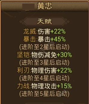 黄忠:橙将二星增加45%暴击,黄忠是一个后排输出武将使用暴击和强大的物理伤害进行攻击不得不提就是黄忠的天赋都是为了输出产生的一个强力武将推荐使用:五星