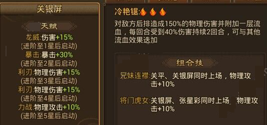关银屏:紫将二星增加30%的暴击,关银屏是一个强力后排武将天赋五星都是增加输出的存在,组合技配合关平和张星彩还能增加20%的物理伤害,是一个强力后排首选。