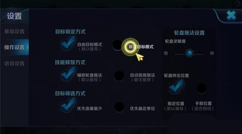指定攻击模式,选推塔补兵,轮盘施法呼出位置,我选的默认。显示可攻击头像,想打谁点头像。