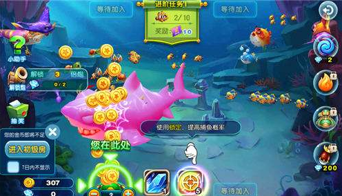 要捕捉粉刺豚这里不建议手动发射炮弹,因为从精准度和频率来讲都要比使用道具来的慢一些,所以还需要一些道具来帮助我们,锁定道具我们可以在捕鱼的过程中捕获鱼类概率掉落,在完成新手等任务时也会获得道具奖励,免费的使用完后可以用钻石购买。要注意和其他道具的配合使用,因为粉刺豚BOSS比较难捕获,移动速度快,当锁定还没有捕获成功,但是鱼即将要溜走时,要及时使用冰冻道具,为攻击争取更多的时间。