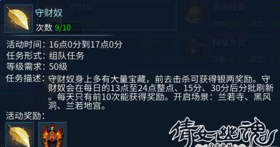 达到50级后就可以参加的活动,装备+银票+少量经验。每天13:00-24:00,刷新时间为(每个整点)(每个15分)(每个30分)。