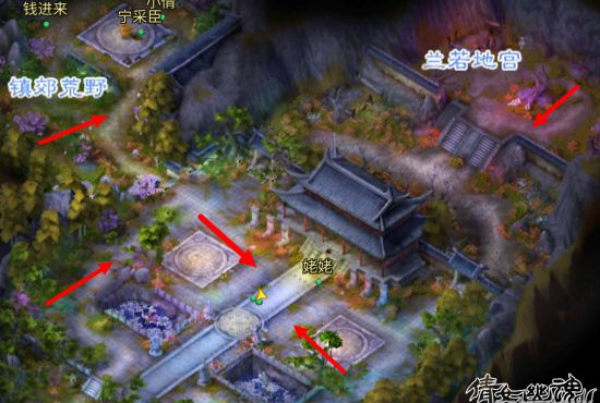 1.兰若寺 首先组好队伍,去1线图中箭头位置等着,一般守财会在这里刷新一到三只。刷新的时候跑动起来吧(后面教你们个新技能)