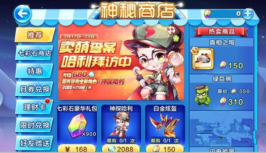 玩家参与欢乐盛典活动,累计充值980钻石可获得流星师爷专属配饰白金炫盔,除了白金炫盔外,还可获得新角色神探哈利的专属单人S级宝物真相之帽以及22000魔法药水。