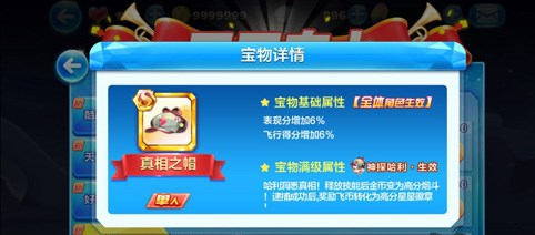 天天酷跑真相之帽是神探哈利的专属宝物,它的专属属性是哈利洞悉真相!释放技能后金币变为高分烟斗!逮捕成功后,奖励飞币转化为高分星星徽章!那神探哈利的属性有一条是追捕犯人的,所以这款宝物其实就是为神探哈利量身定做的,那么就绝对是有入手的必要的!