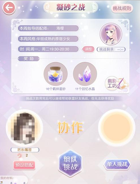 凝砂之战就是一个联盟组队玩法,玩家需要根据凝砂之战中搭配师给出的要求来选择好装扮,然后组队挑战。之后会掉落凝砂之战的服装制作材料。