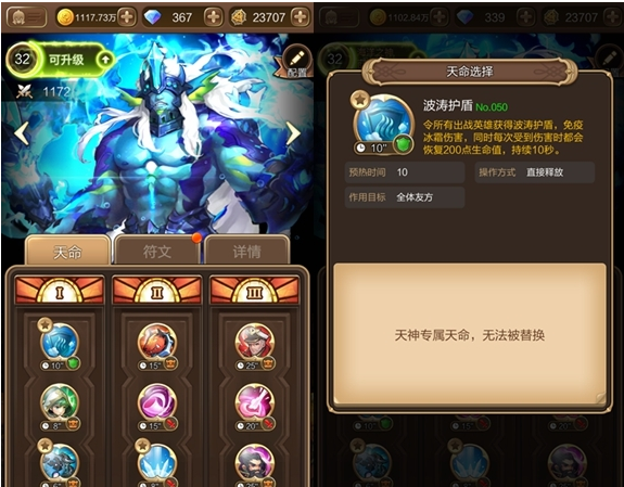 唯一能抵抗闪电伤害的雷神还没能够获得,所以继续使用比较常见的海洋之神:在出战中队长绝技等级提高;同时为所有出站英雄和友方单位回复2550点生命值。