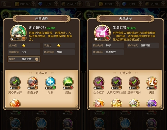 天命搭配上以治疗型和带嘲讽的召唤型天命为主,如果旅团不能打断技能,那Boss的绝招每次都能带走各个英雄大约6000~8000的血量,对于以输出为主的英雄来说分分钟致命,所以湖心镇牧师和生命虹吸、大祭司萨尔法隆必出。同时佩戴拥有嘲讽技能的天命熔岩犬和温德尔元帅,目前就是拉扯主Boss,转移Boss被动技能的攻击对象,降低后排英雄的损失。