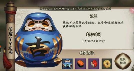 荣耀V9发布会开放了阴阳师大吉达摩LBS活动,定位现场即可挑战大吉达摩,奖励勾玉、体力和达摩奖励,下面来看看最新的活动说明吧。
