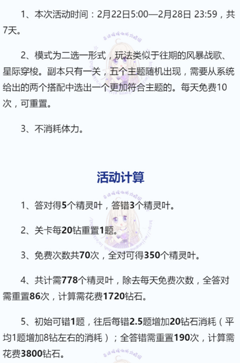 活动说明&顶配分析!副本只有一关,五个主题混合在里面随机出现,全对要1720钻,全错3800钻!五个主题类似竞技场关卡,具体看图
