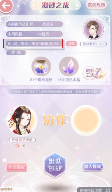 联盟搭配战的固定时段为19:30-20:30,一周可开启两次(默认设定为周六、周日开启)。联盟会长/副会长可以根据成员的闲暇时间,重新调整开启日期。在周一至周日中任意指定两天,作为自己联盟的搭配战开启日。