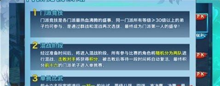 此活动在每周三、周日的21:00正式开始,同一门派所有等级30级或30级以上的弟子均可参与。混战结束后在参加的少侠就无法获得参与奖励了,所以想要获得参与奖励的少侠们要注意活动时间哦。门派竞技的竞争要通过晋级赛(混战))和淘汰赛(单挑)两个大阶段。混战阶段分三场,单挑分为16强、8强、4强、半决赛、决赛,最终得出本届“新人王”的称号。喜欢PK喜欢比武的少侠这场热血盛宴,不容错过。
