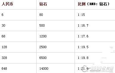 6元档RMB:钻石比例是1:15,68元档比例是1:17,648档比例是1:21