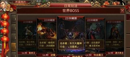 系统每天都会定时刷新世界BOSS,击败BOSS可以获得顶级装备和技能书。而且顶级装备爆率极高,技能书偶尔掉落。45级BOSS禁地魔王,战士击杀后一定概率掉落神装雷霆怒斩、神武战甲。同时一定几率掉落高级技能书突斩、金刚护体。