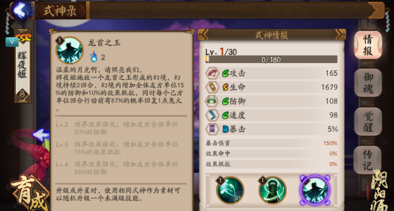 主动技能“龙首之玉” (幻境):辉夜姬放出幻境,持续两回合,增加全队防御25%及效果抵抗20%,同时每个友方单位行动前都有67%的几率得到一点鬼火。此技能与其它两个技能相结合,相当于被打和进攻回合都有几率获得鬼火,如果运气好就可以不断鬼火连续放大招,并且在战斗开始为队友增加效果抵抗和防御两回合,技能消耗只需要2点鬼火,性价比很高。
