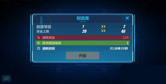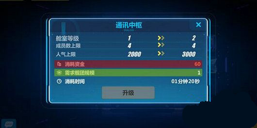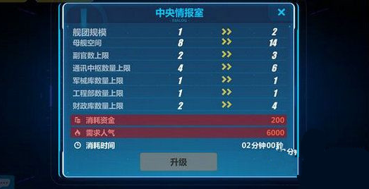 舰团中有几个不同板块,提供的功能不同,舰团可通过消耗水晶、人气、资金、燃料等等资源升级。