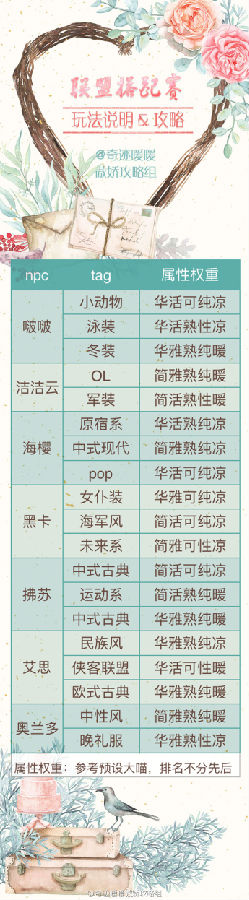 联盟搭配战的主题以及属性权重如下,可参考预设大喵的服装。