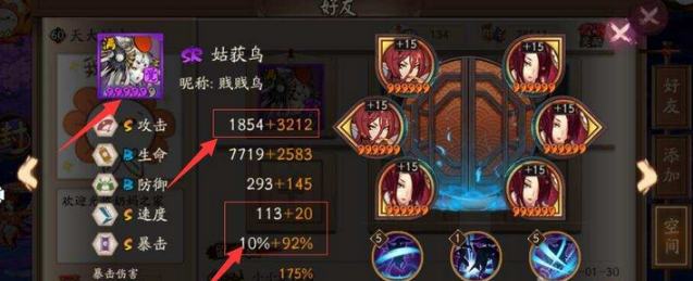 大家在去看一下第一张图中的属性以及御魂搭配:御魂:针女四件套,两件套优先推荐暴击两件套