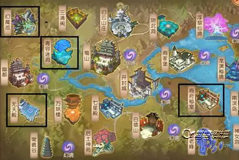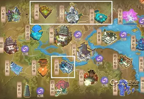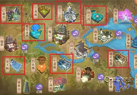 首先我们要知道出卦灵的地图,它们分别是:幻魔池,三清阁,归云山庄,阴沉洞,青容迷洞,无天殿,七星殿和商府密室。(如下图红框)