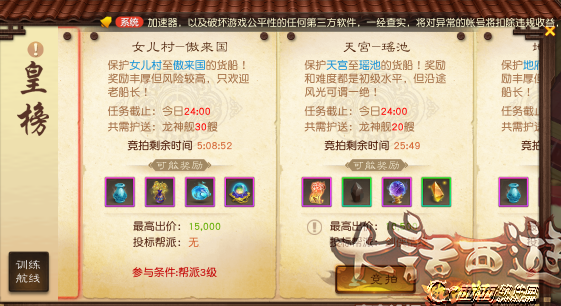 除了竞拍之外,作为低级帮派的帮主也可以使用训练航线,训练航线不需要竞拍漕运航线,所有帮派都能够参加,并且不需要花费任何帮派资金,可以直接领取任务。不过由于没有帮派奖励,因此被打劫的几率应该来说是最低的。不竞拍的漕运航线总共为15条船,而竞拍则为20条。