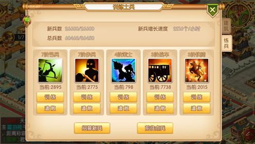 4、士兵遣散:将玩家已训练的士兵遣散掉,预防玩家训练某个兵种过多导致无空闲的士兵数训练其他兵种的情况出现。