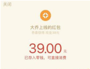 打开手机微信app,点击游戏,就会出现大乔女神惊艳登场的画面,点击领取女神福利,活动期间拥有大乔就可以打开红包,如图,开到了39元。