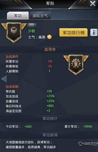 在世界地图参与战斗即可获取军功,当军功累积到一定程度便可自动提升军衔。随着军衔级别的不同提高,所需的军功也会越来越多。因此提升军衔的关键,就是认真对待每一场战斗,尽全力摧毁敌人,夺取胜利。而且摧毁敌人武器越多,武器越高级,所获得的军功就越高,提升军衔的速度也就越快!