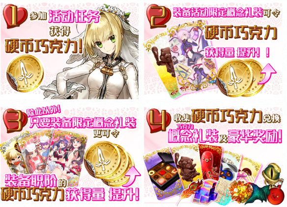 装备活动限定概念礼装,可以增加活动专属道具『硬币巧克力』的掉落数量。