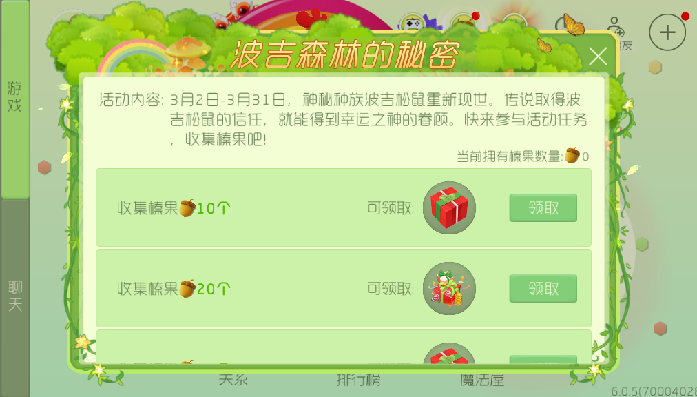 活动内容:在活动期间,神秘种族波吉松鼠重新现世。传说取得波吉松鼠的信任,就能得到幸运之神的眷顾。快来参与活动任务,收集榛果吧!
