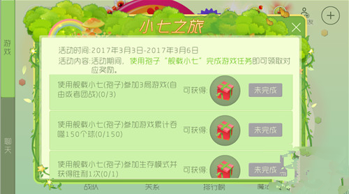 使用舰载小七(孢子)参加游戏累计吞噬150个球(0/150),可得一份森林春装礼盒;