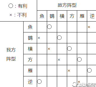 | 雁行阵 | ▼ | ▲ | ▲ | ▼ | 左翼前进,右翼往后的阵型。 | 牺牲防御,力压敌人的速攻型。 如果有快速扫荡敌人的压倒性攻击力的话可用此阵型。 | |