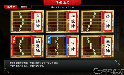 | 鹤翼阵 | ▲ | ▼ | ▼ | V字阵型。 | 牺牲防御和机动,大幅提高攻击力的攻击型。※注意我军受伤害的风险也会增大。 | ||
